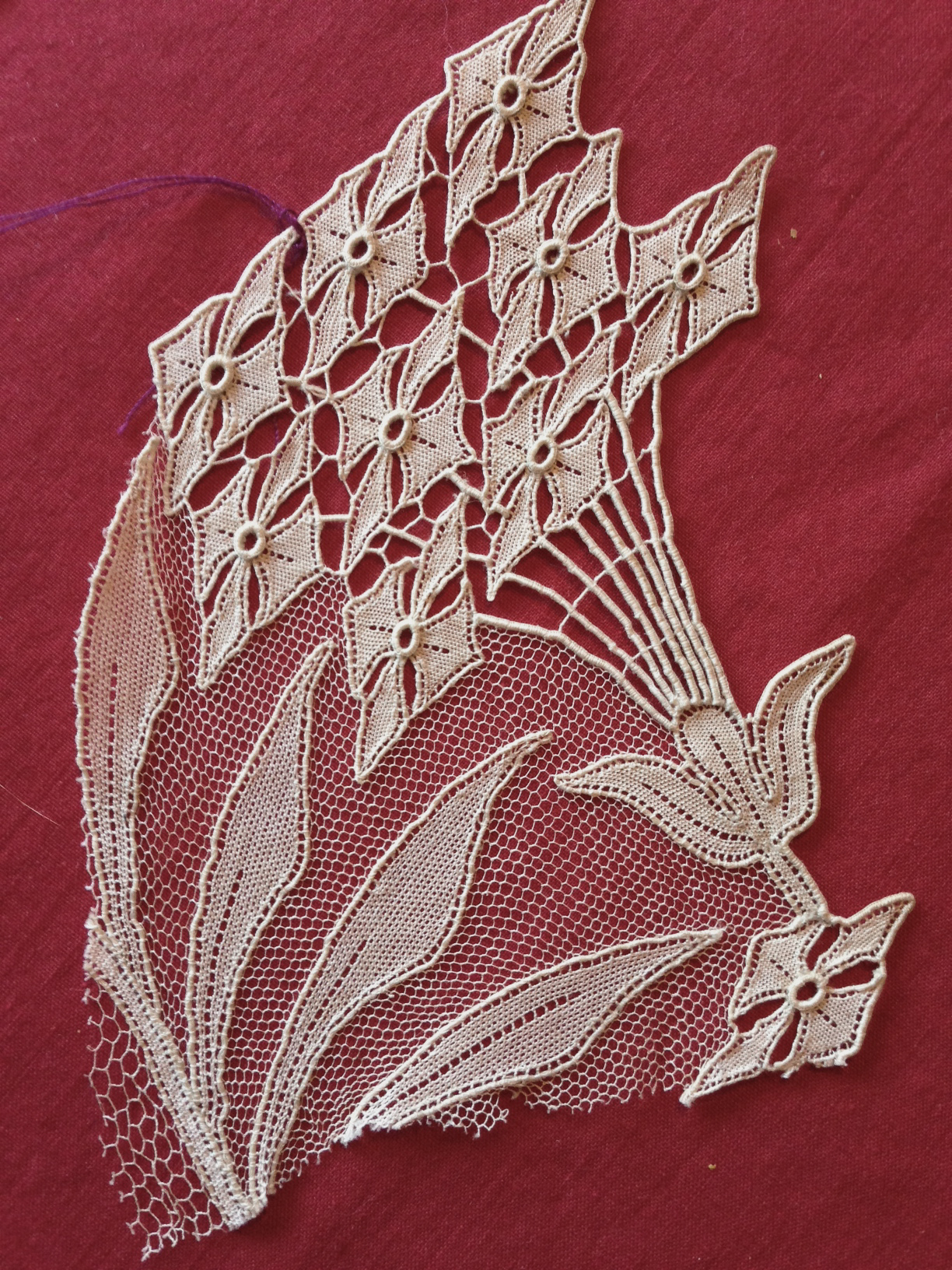 The variations on buttonhole stitches easily define this piece as needle lace. The specific way it is worked, including the flat edges combining with a background mesh sets it apart. Classic needle lace techniques such as Point de gaze, Alencon, Point de Venise a Reseau, etc, define how the clothwork, outline, mesh, and connecting bars are worked. A set combination of stitches used in specific ways define those laces. In Art Nouveau pieces, the design itself determines what stitches are to be used and how they are used.