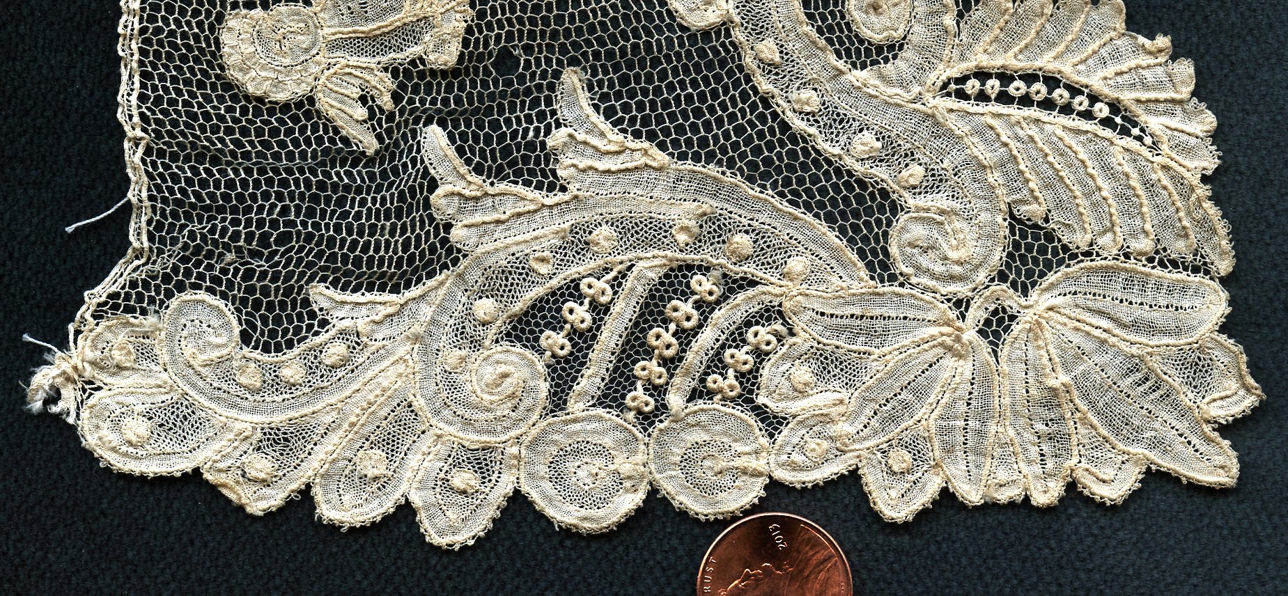 I had just minutes to choose, negotiate and pay for the lace. I noticed that whatever it was, there were a pair, that there were scrolls of Brussels bobbin lace and a background mesh of Point de Gaze, with a few holes. For the right price I could take a chance. The scrollwork appeared to be of better-than-usual quality.
