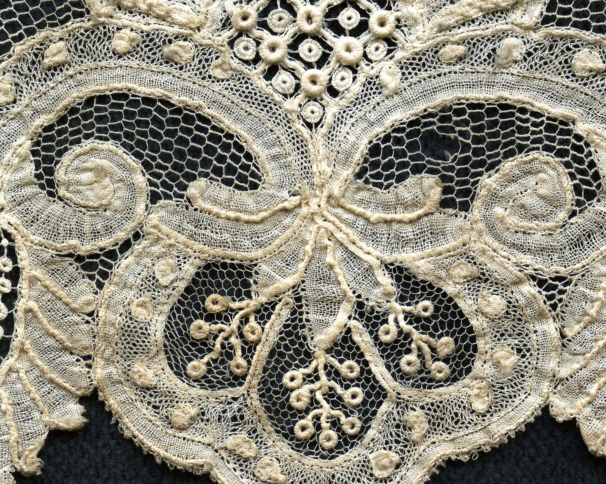 Another unusual, interesting feature: The background is a point de gaze mesh, but done with two different weights of thread. The main background is slightly heavier thread than that used behind the needle lace fillings. An echo of the Alencon technique, around 1800, of using a petite-reseau along the bottom of the lace.