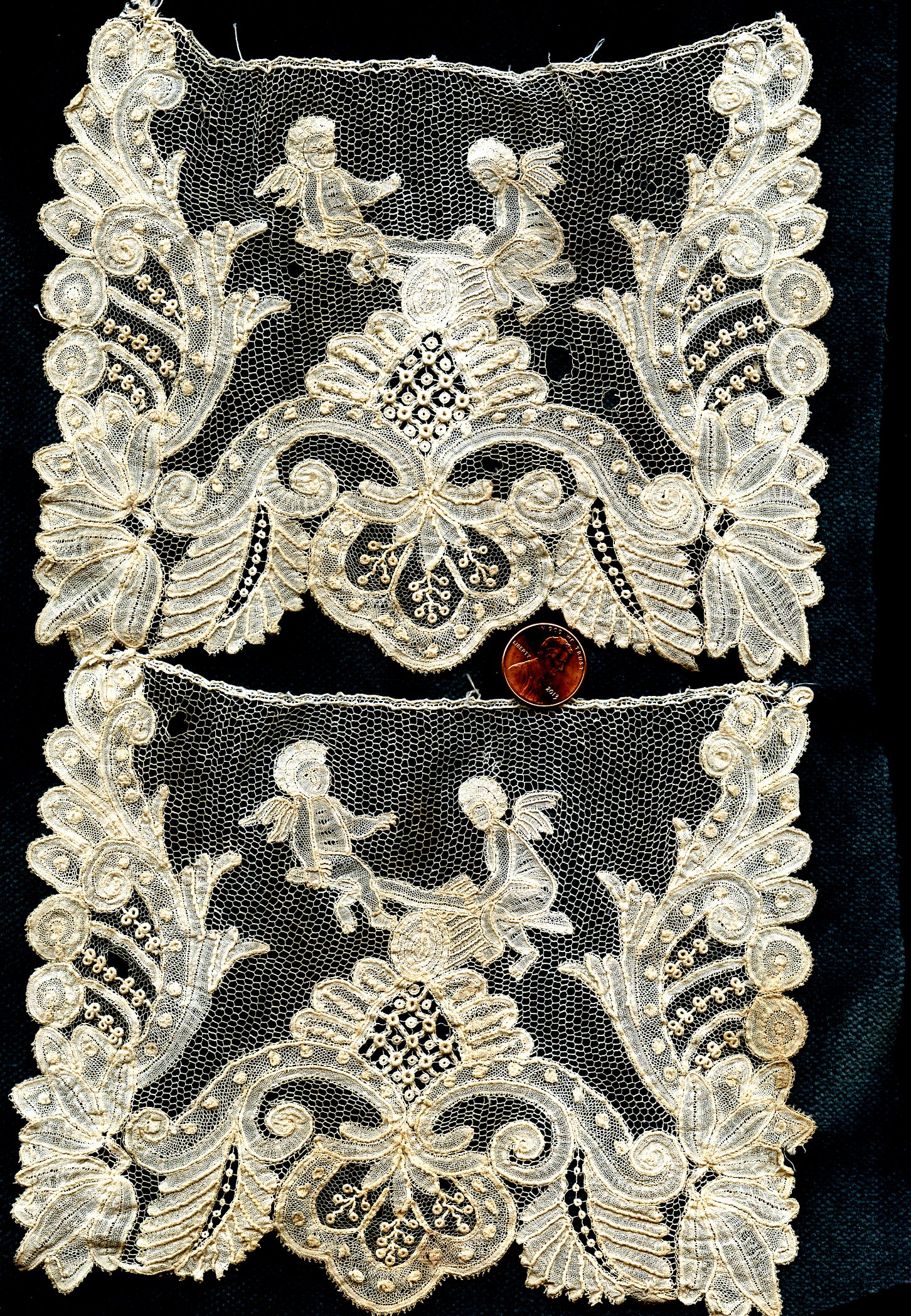 The combination of elegance, a bit of secrecy -- these are after all cravat ends, which would be gathered when worn, and the little scene obscured -- and sheer silliness of a cherub's pumpkin face makes this pair of lace pieces irresistable.