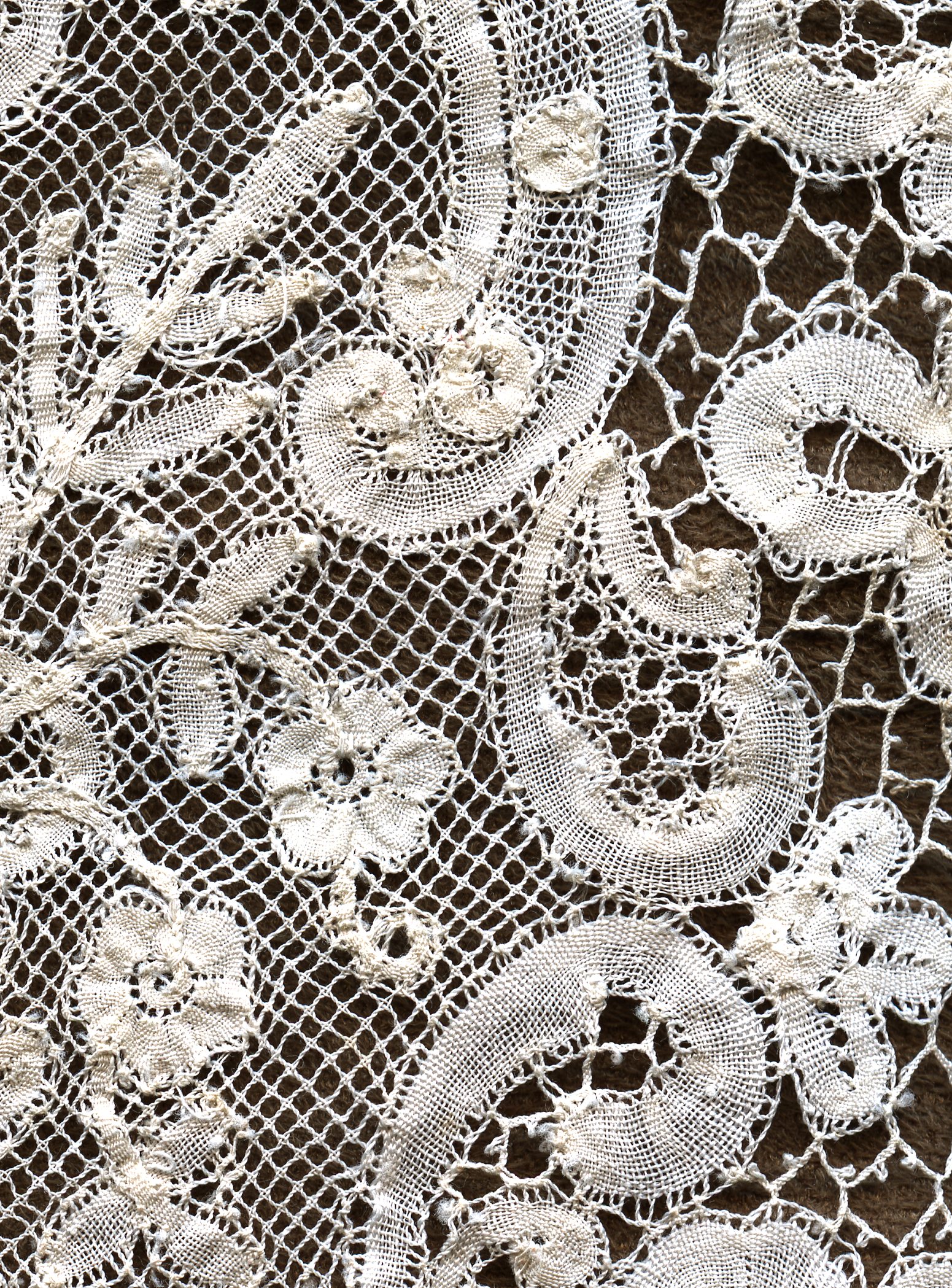 Now I wish I had. I'd like to compare them to the inserts in my berthe. Two of the little motifs surrounding the inserts in this berthe do not match the scrollwork that surrounds the rest of the insert. Instead, they match the background, and integrate the insert into the whole berthe. Curiously different from the usual.